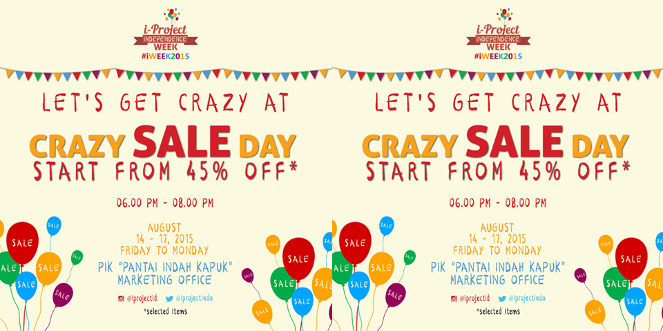 Come to our “CRAZY SALE DAY” ! We give you all discounts for our apparel tenants that starts from 45% for selected items in the period of 6PM-8PM ! Besides, there will also be many interesting thing and games you can find at i-Project Independence Week #iWEEK2015.